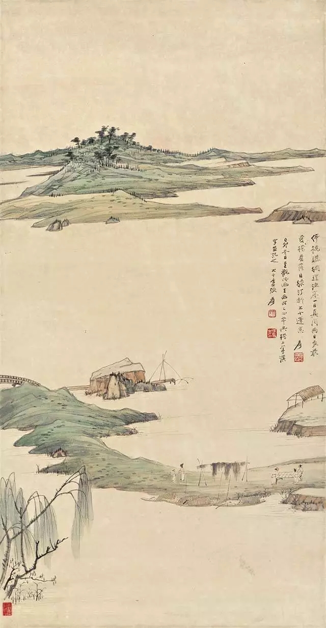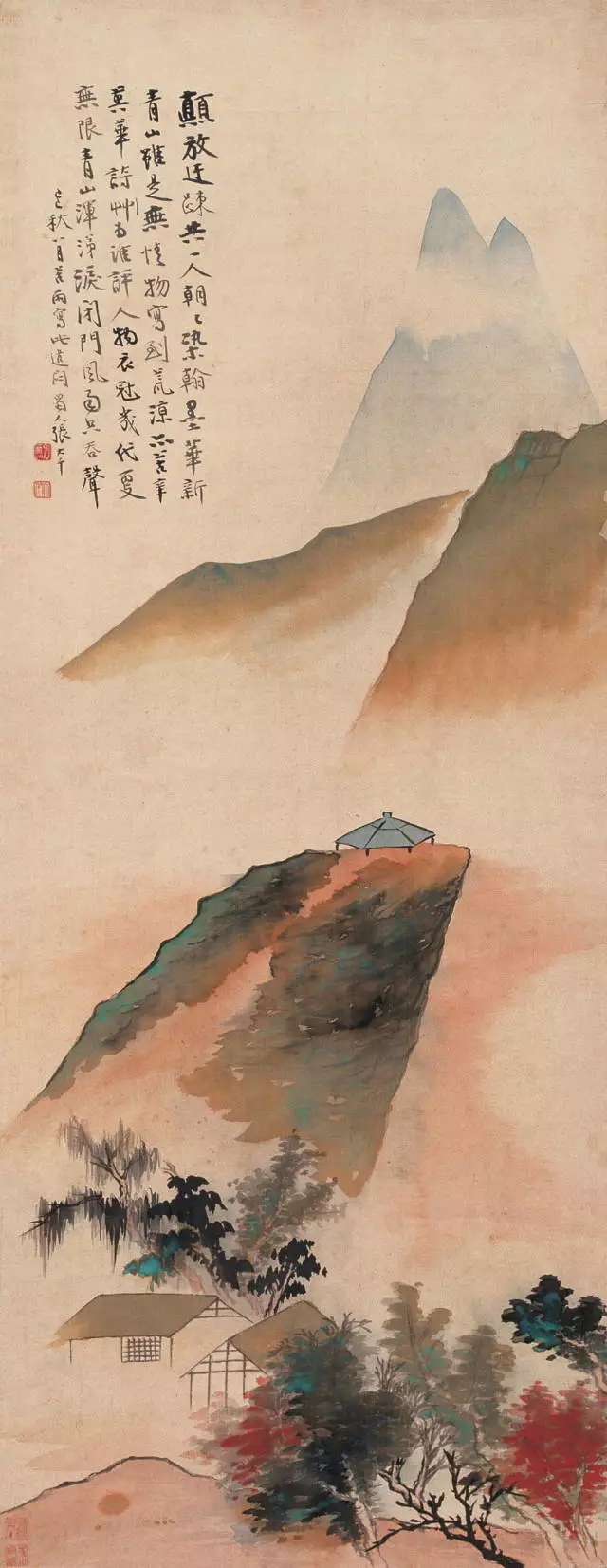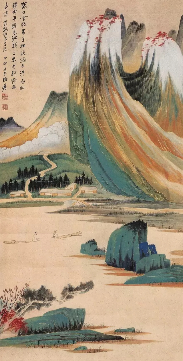 張大千山水畫《漁村夕照》
