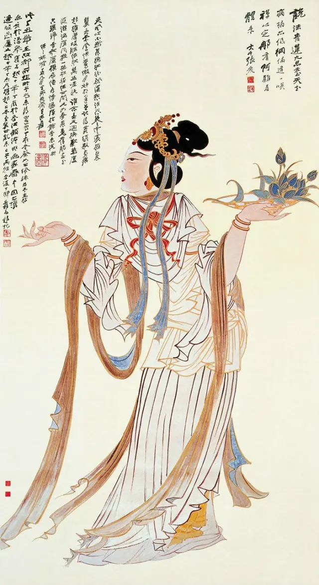 張大千是全能型畫家,其創(chuàng)作達“包眾體之長,兼南北二宗之富麗”,集文人畫、作家畫、宮廷畫和民間藝術為一體。于中國畫人物、山水、花鳥、魚蟲、走獸,工筆、無所不能,無一不精。詩文真率豪放,書法勁拔飄逸、外柔內(nèi)剛、獨具風采。