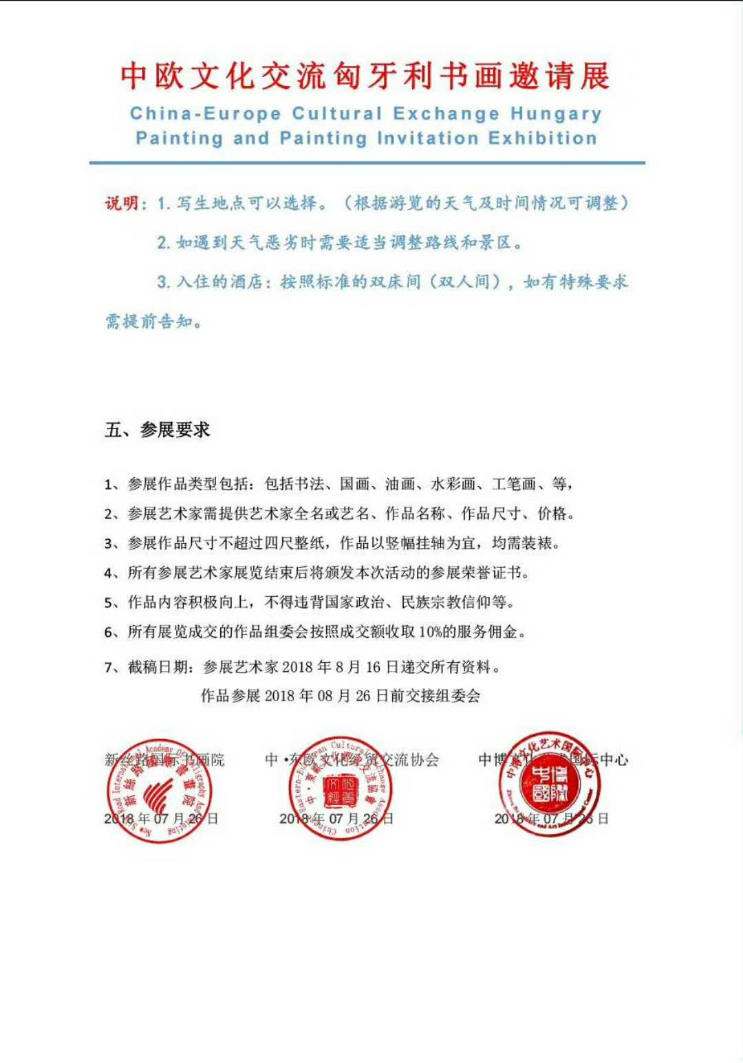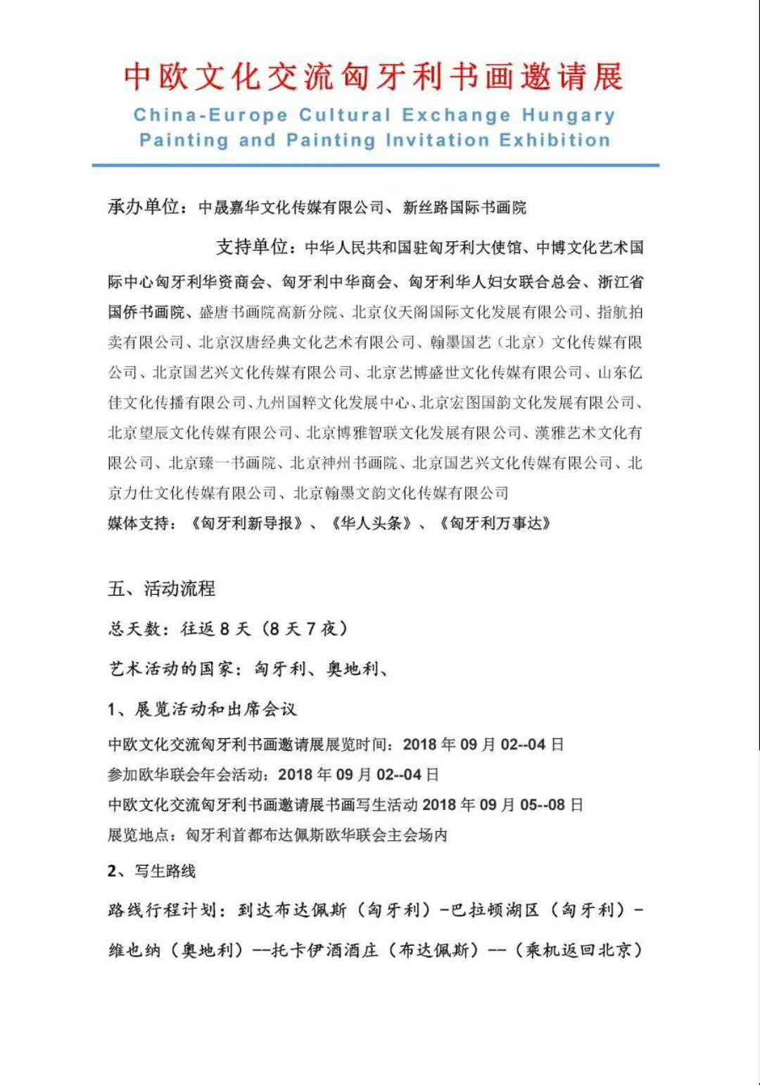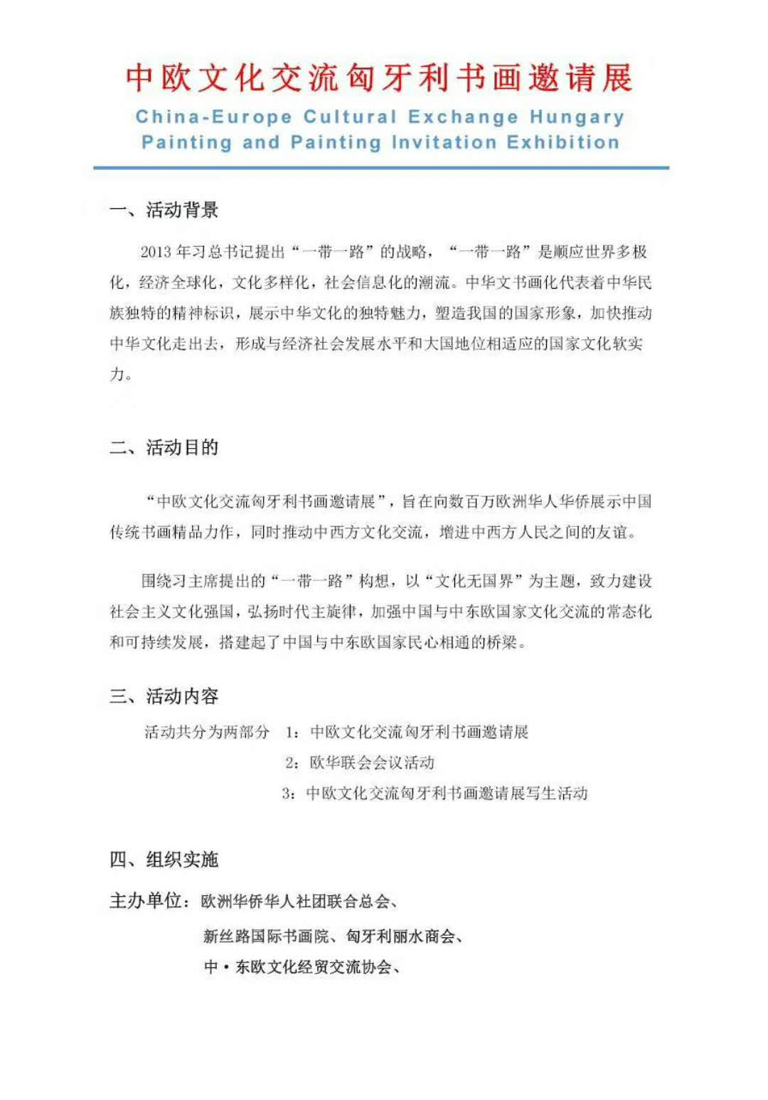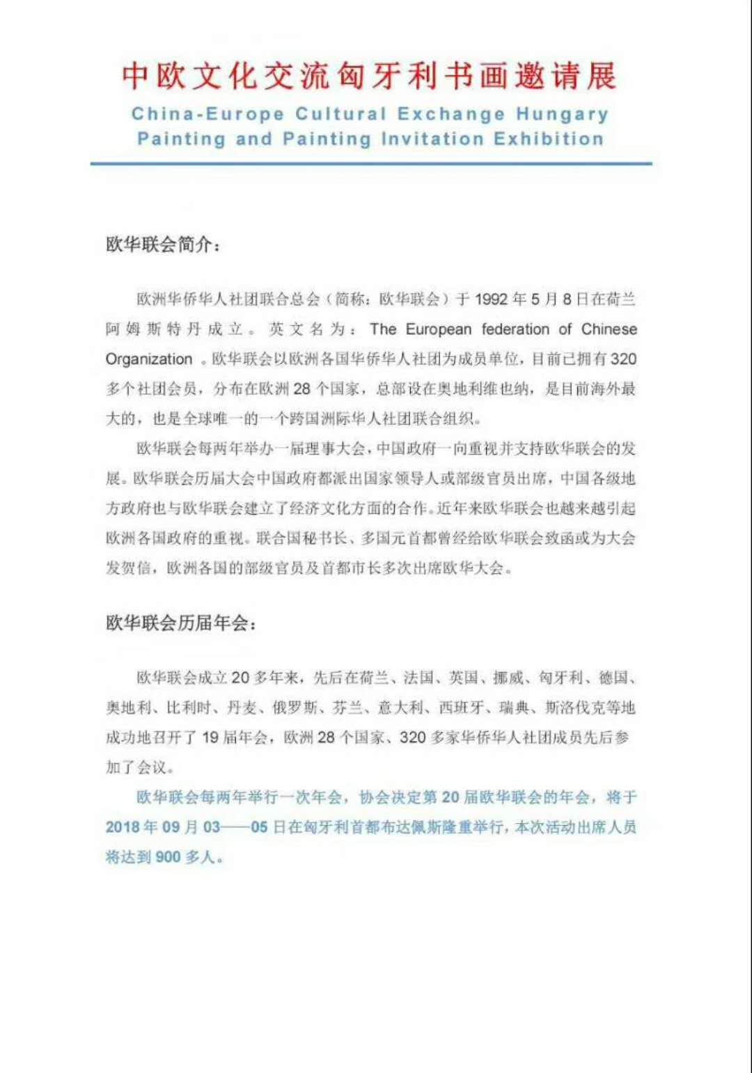 中歐文化交流匈牙利書畫邀請展展覽時(shí)間:2018年09月02--04日 參加歐華聯(lián)會年會活動(dòng):2018年09月02-04日中歐文化交流匈牙利書畫邀請展書畫寫生活動(dòng)2018年09月05--08日 展覽地點(diǎn):匈牙利首都布達(dá)佩斯歐華聯(lián)會主會場內(nèi)