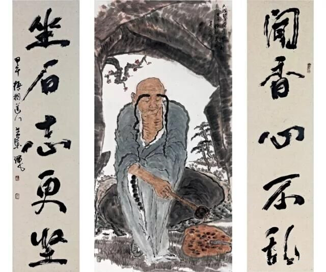 再品“老竹新芽”用橫筆加色法畫出的枯竹,用狼豪長鋒畫出嫩竹,一反清代"揚州八怪"鄭板橋畫竹的清風勁節(jié)的傳統表現手法,畫面充滿了佛家生命輪回的禪機。