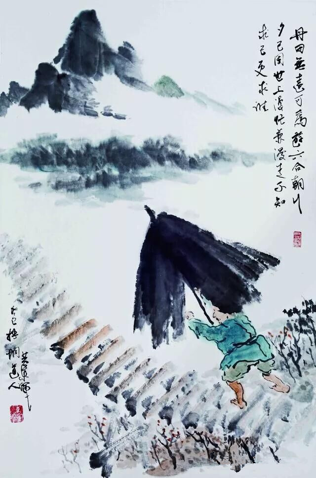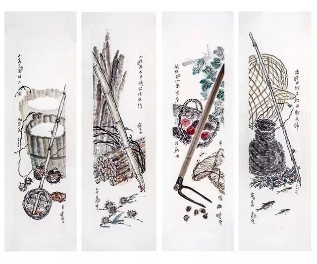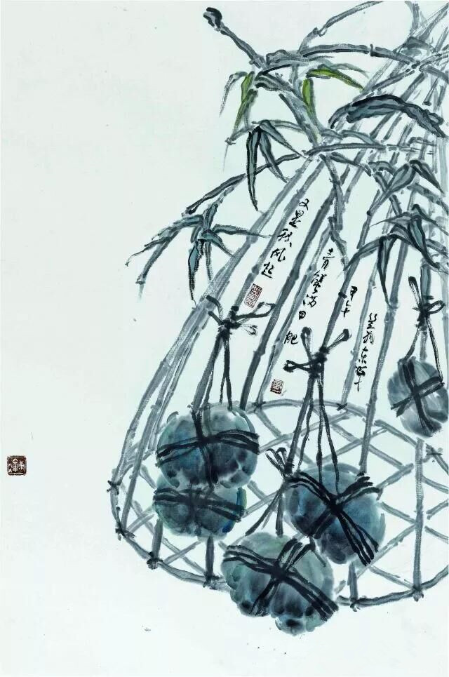 細品“農家樂、菜根香”主題上充滿了都市人回歸自然、向往鄉(xiāng)村、榮歸故里的儒家道家精神。技法上有所創(chuàng)新的蕉葉用濃重彩橫掃出野蕉葉殘破的現象,用赭石原料點蟲眼,水桶用無骨畫法出,干凈利落,菜園用淡彩淺墨配景,畫面筆墨風格與傳統用筆方法迥然不同,構圖上主次顛倒、虛實錯位、令人耳目一新。