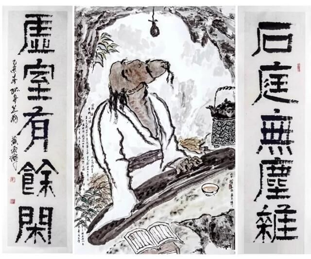 四品書法對聯“臨窗邀石聽谷雨,憑欄對月浴松風” 作品具有漢碑石刻和清代“金農漆書”之風格融合,用筆大膽橫寫,抖動前行,作品顯石鑿金刻、鋼烈正陽、蒼勁老辣之氣,落款有黃庭堅之野逸、王鐸之蒼勁,宛如游龍出水、勁隼沖天、充滿張力,十分耐看。