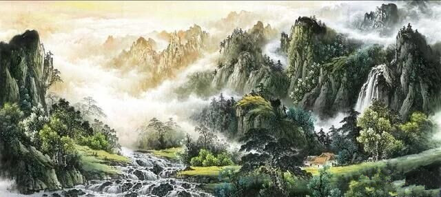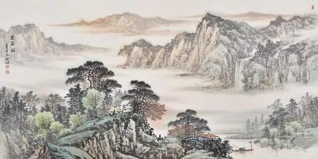 在淺絳基礎(chǔ)上進(jìn)一步用花青、墨青或者花青調(diào)黃色,進(jìn)一步豐富層次、淡染,把各個景物染得氣韻相生渾然一體,一般的著色山水畫就完成了。