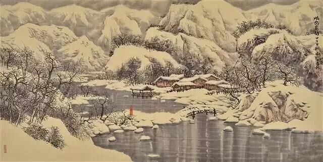 傳統(tǒng)山水之雪景一般用留白的辦法畫雪的效果。雪景山水的勾輪廓的墨色不要太重,色度不夠可以慢慢地加勾。雪景山水的皴法比較少,但是要注重的是染。用淡墨染出厚度,決不能空洞無物。臨摹前很好地分析臨本,力求找到雪景山水的規(guī)律性的東西。